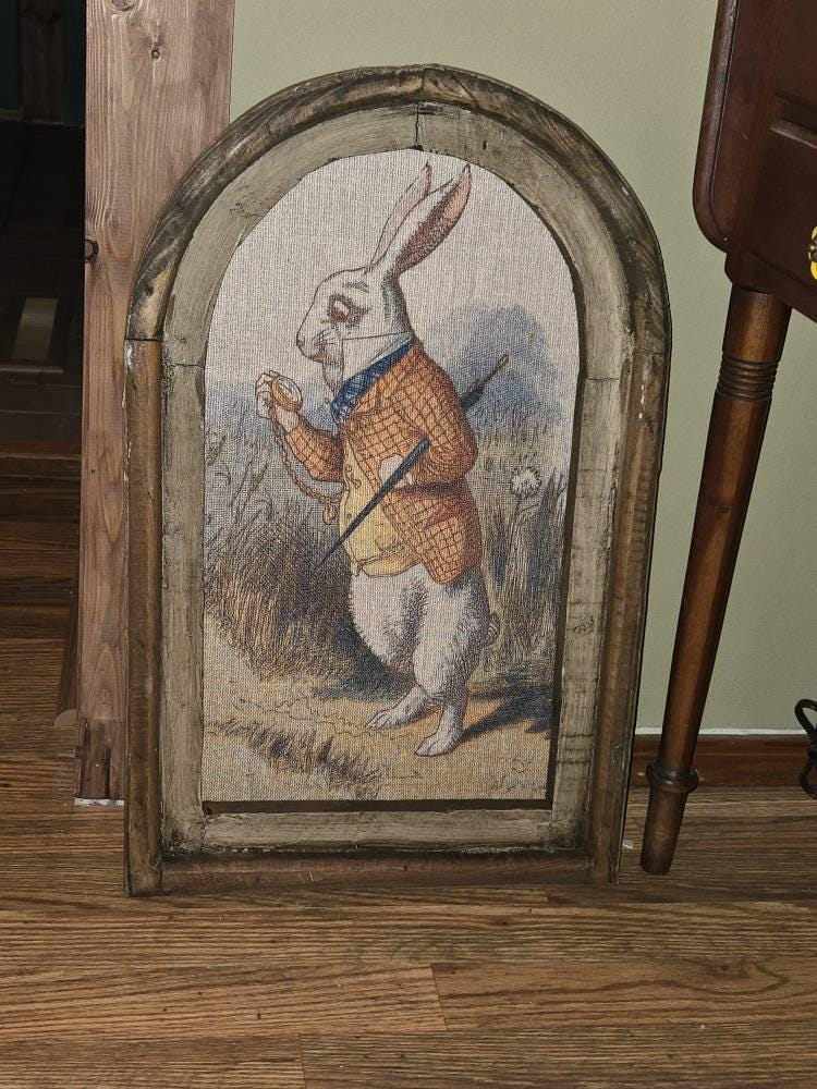 The linen was carefully printed and framed in a reproduction arch window frame.
