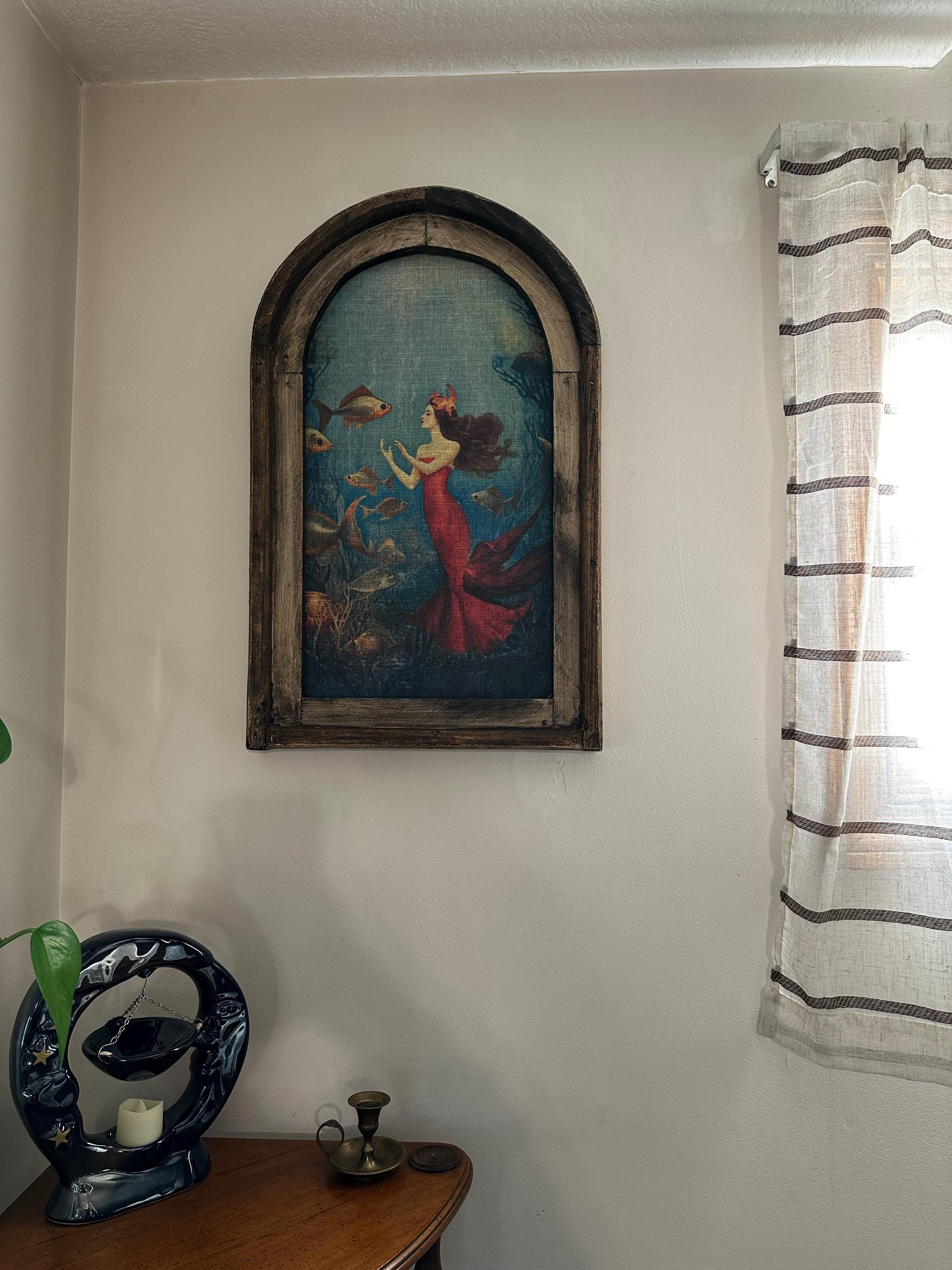 The linen fabric was carefully printed and framed in a reproduction window frame.