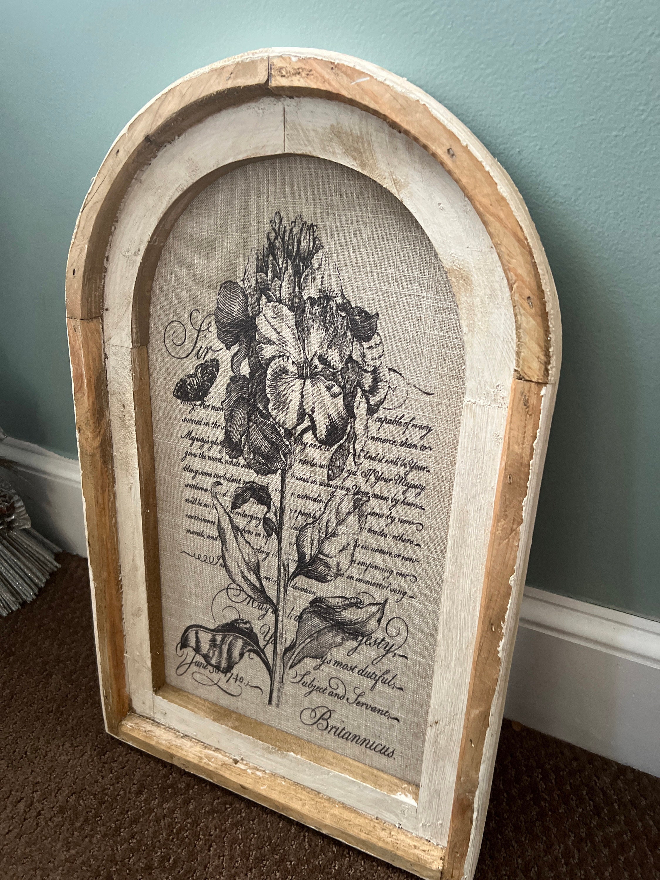 The linen was carefully printed and framed in a reproduction arch window frame.